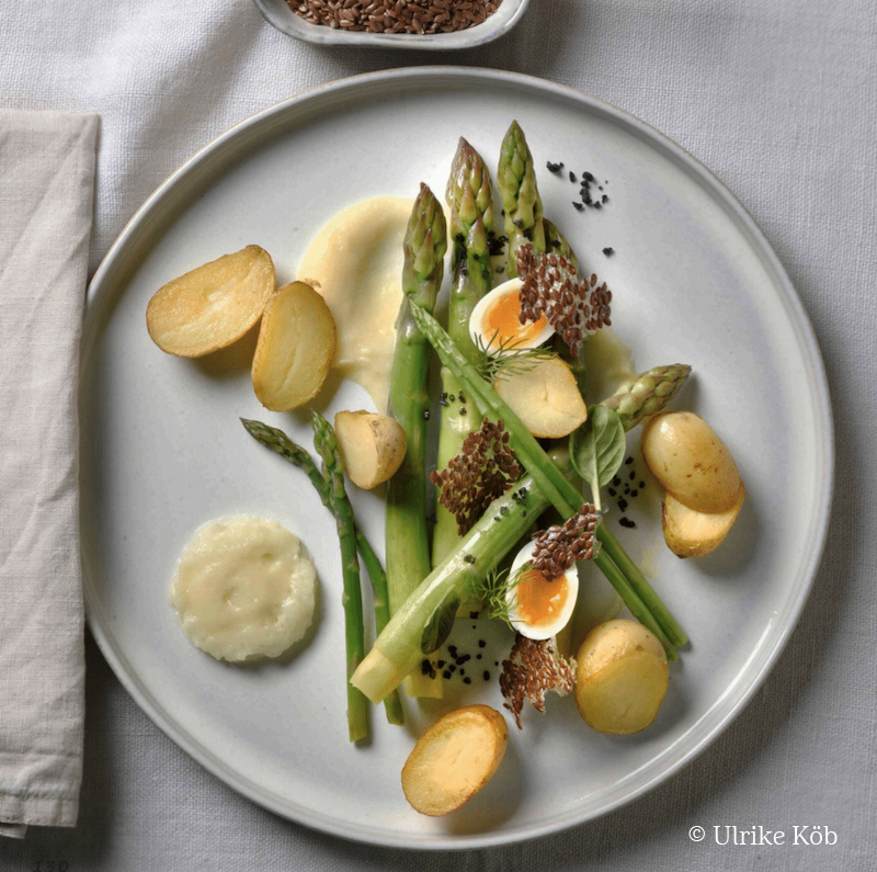 Kartoffeln schälen und in einer Pfanne in ca. 1 EL Ghee anbraten, mit Steinsalz würzen. Spargel mit Kartoffeln, Hollandaise, Crackern und Eiern anrichten.